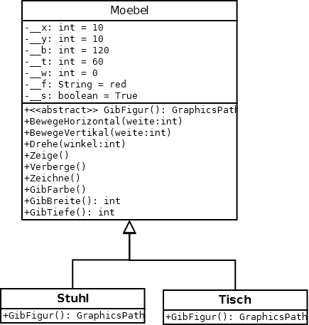 Wir suchen die gemeinsamen Attribute und Methoden aller Möbelklassen, abstrahieren dabei von einer konkreten Möbelklasse und definieren das Abstraktionsergebnis durch eine eigene Klasse Moebel. Diese stellt nun die allen anderen Klassen gemeinsamen Eigenschaften bereit und die von ihr erbenden [abgeleiteten] Klassen enthalten nur noch genau die Methoden, in denen sie sich unterscheiden. Dadurch erweitert jede erbende Klasse die Oberklasse [vererbende Klasse] um ihre speziellen Methoden.
